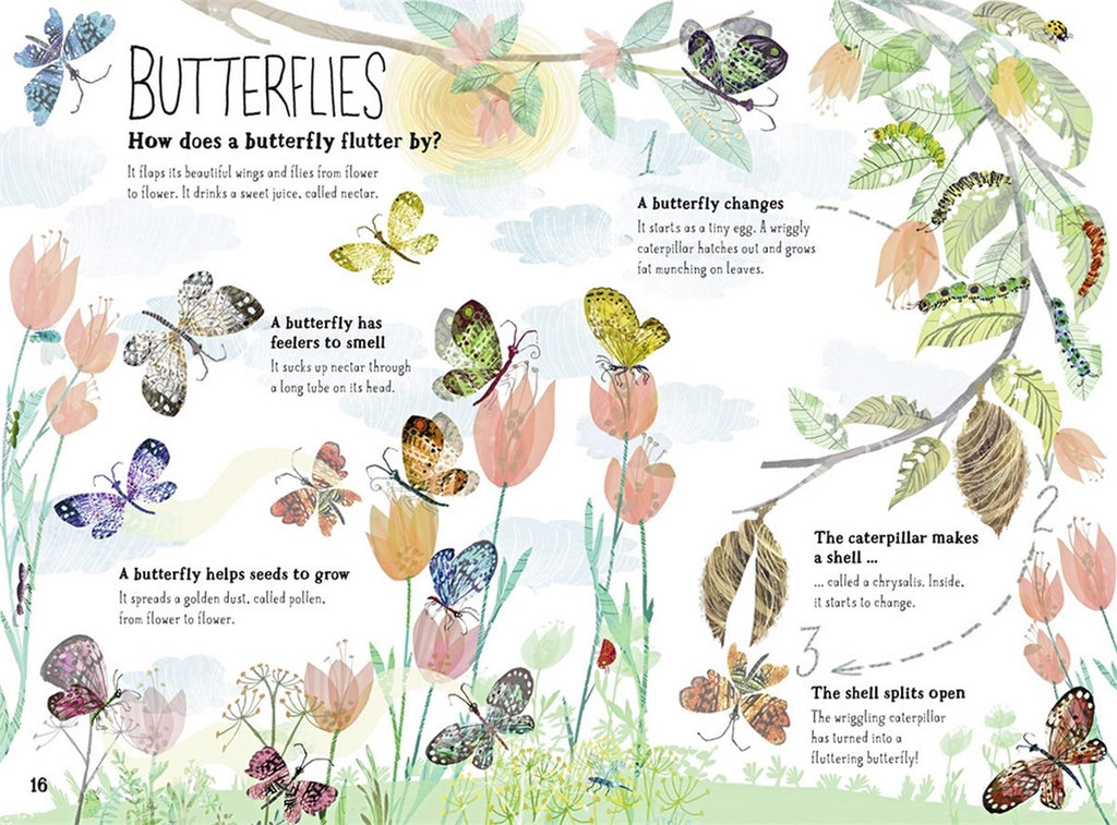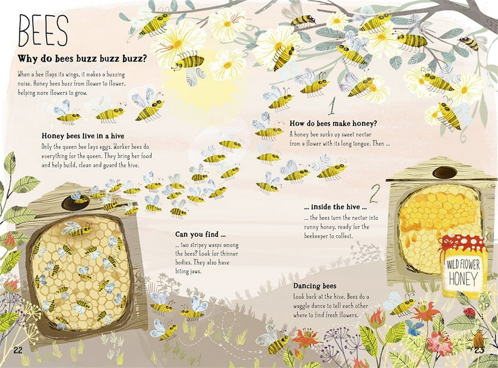 Some spreads approach the world of bugs thematically, such as bugs that come out at night, baby creepy-crawlies and life cycles, how bugs hide and show off and how some bugs love to live in your home.