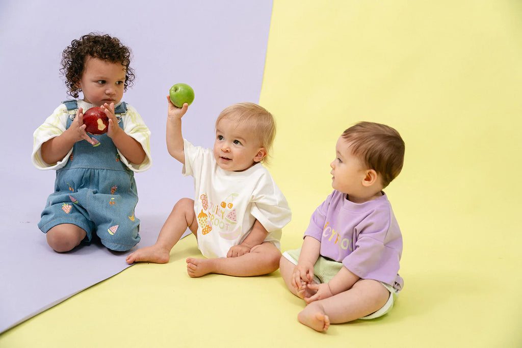 A playful addition for your child's wardrobe this Spring. The Myla Jane vibrant Juicy Froot T-Shirt Rompers are easy to style in bright and playful hues.