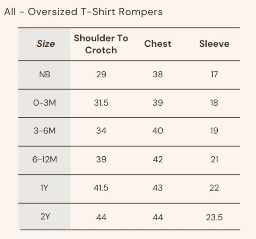 The T-Shirt rompers are an oversized fit and we recommend choosing your child's usual size, or sizing down if you're in between sizes. Made with soft, quality, durable cotton that's intended to last.