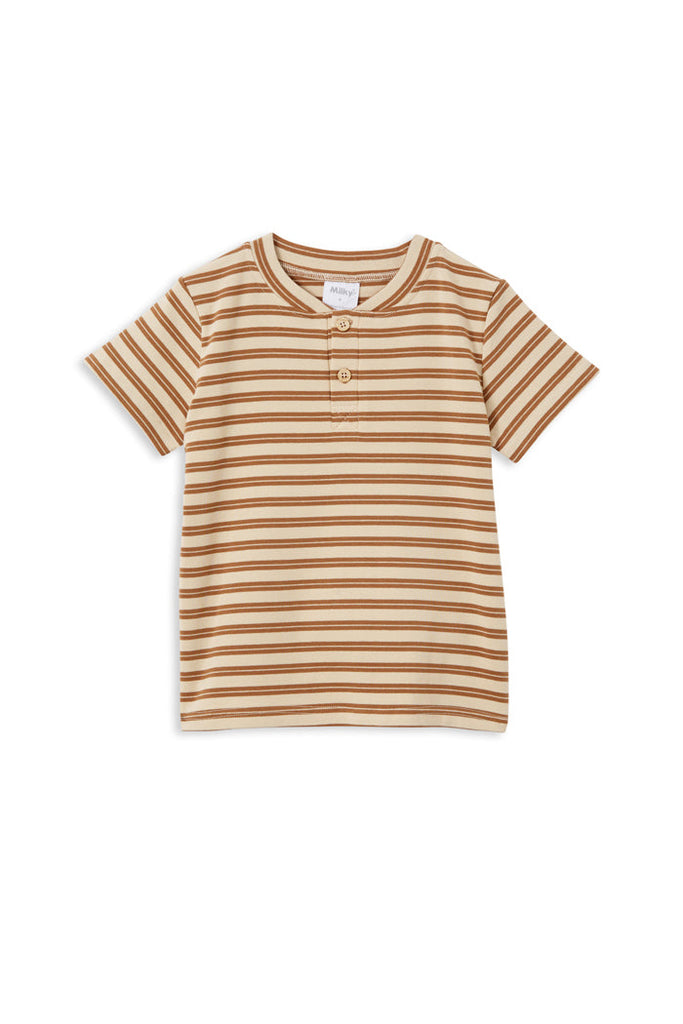 Milky Clothing Natural Stripe Henley, a wardrobe staple for this summer season. Crafted from a rib cotton blend fabric, it's designed with practicality and comfort in mind. The tee features two functional wood-look buttons down the center front for easy dressing, adding a touch of style to its classic design.