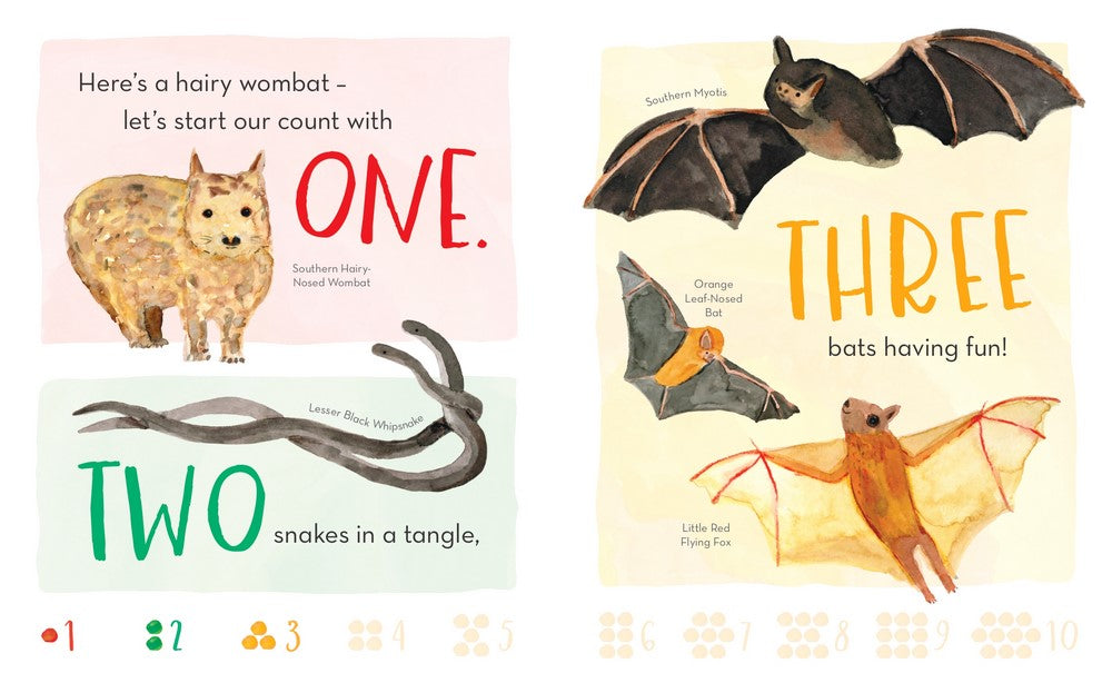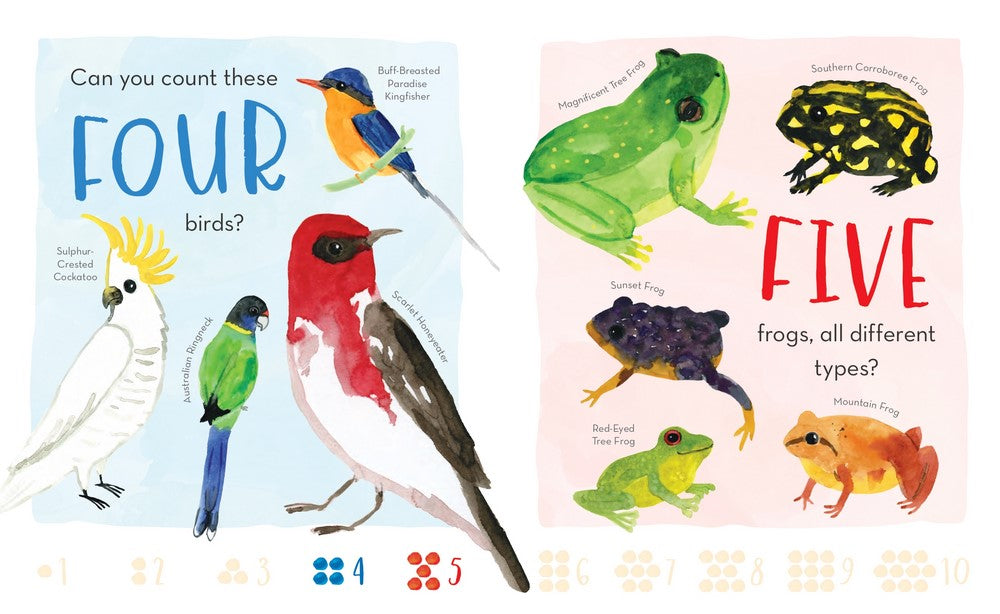 Explore Australia in this first concept board book about counting. From one wombat to ten sea creatures, here is an introduction to the wildlife of Australia for the littlest nature-lovers.