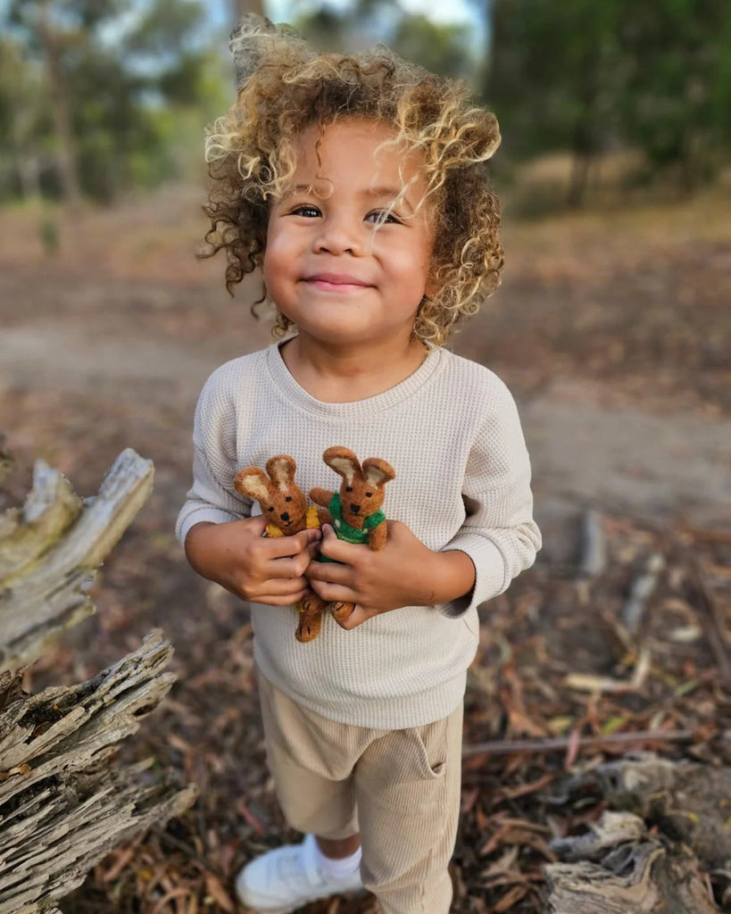 Hop into a world of imagination with the Tara Treasures enchanting felt brown rabbit hare wearing mustard green overalls!
