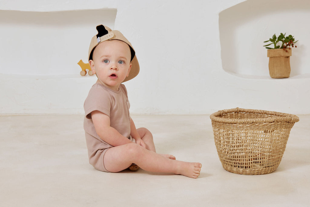 Introducing the Kapow Kids Taupe Rib Bodysuit! Made from soft and stretchy ribbed fabric, this bodysuit is a great basic for your little ones wardrobe. Perfect to wear on its own or layered under Kapow Kids rompers or with shorts.