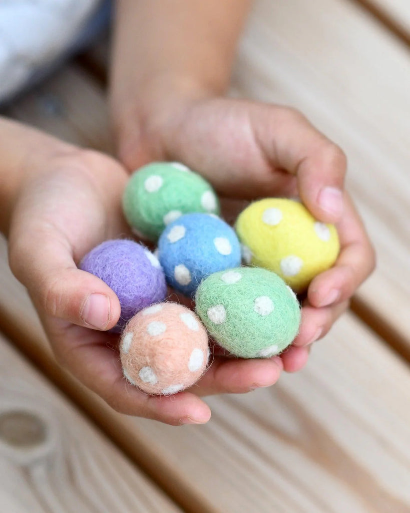 These felt eggs in pastel colours are fun and decorated with little felt polka dots. They are available in a set of 6 different colours - green, mint green, yellow, blue, lilac and pink.