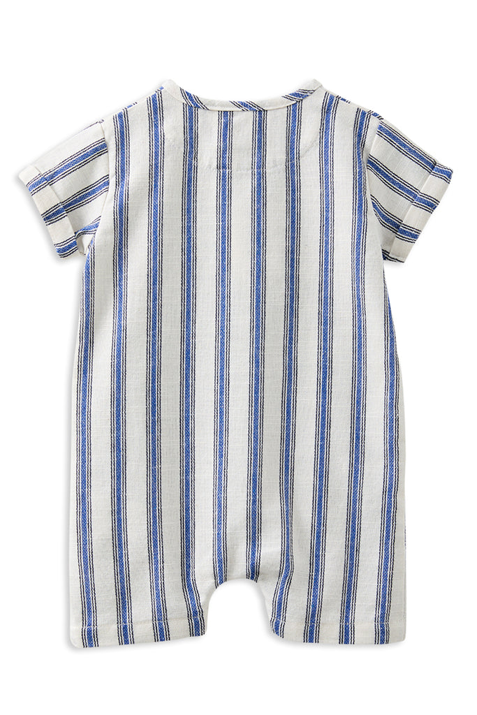 Milky Clothing Stripe Linen Romper, a delightful summer ensemble crafted from breathable cotton blend fabric, perfect for warm weather adventures. Designed to suit both boys and girls, this classic piece features convenient snaps at the crotch and buttons at the center front, ensuring effortless changes. This romper is going to receive compliments with each wear. This stripe fabric is also offered in a shirt and matching shorts, undeniably the must-have print of the season.