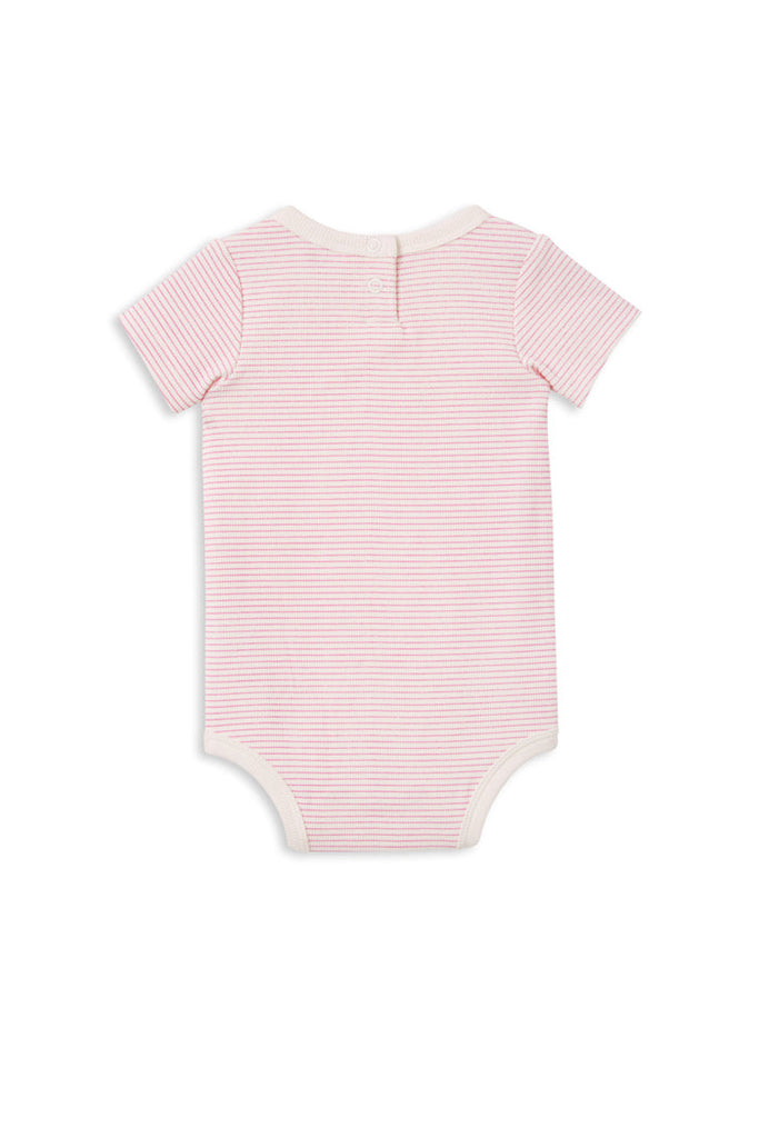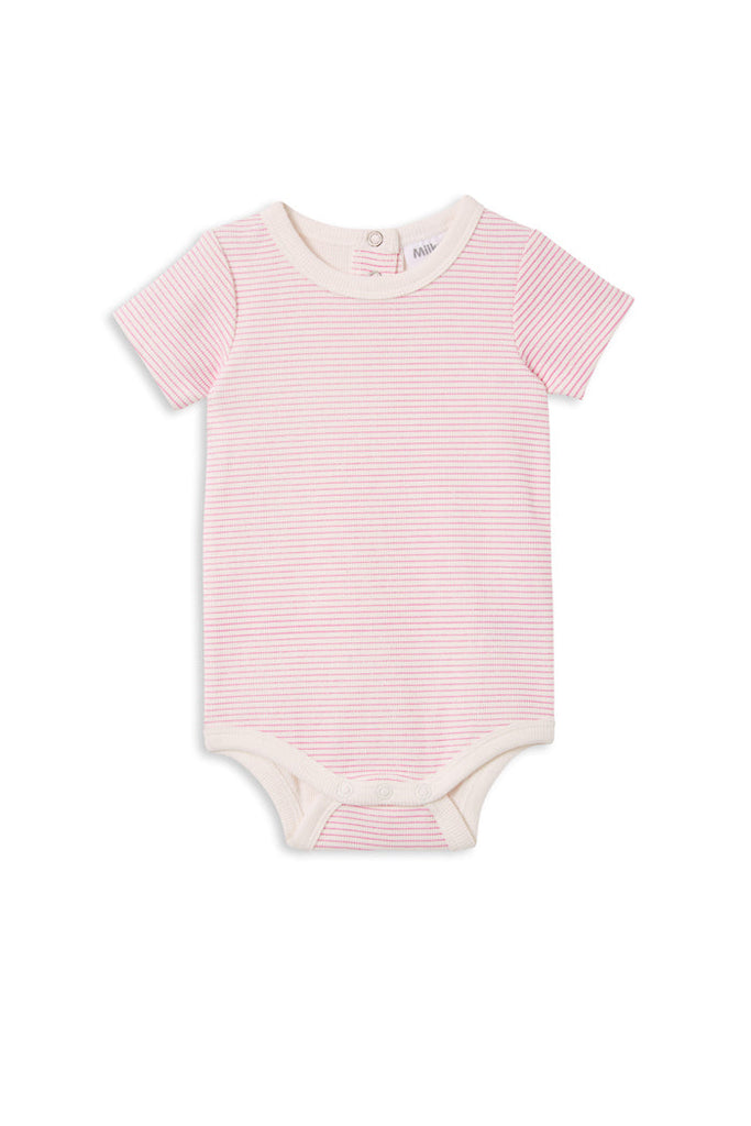Milky Clothing Pink Stripe Rib Bubbysuit. Your little one will be styling in this classic all-season staple! Our Bubbysuit is the perfect wardrobe must-have, with short sleeves for summer, and layering capability for when it gets cooler. Super versatile and comfy fabric ensures your little one stays cozy from playdates to bedtime. Available in many different colours, this garment promises durability, it's sure to become your go-to item that withstands wash after wash, promising longevity and continued comfort.