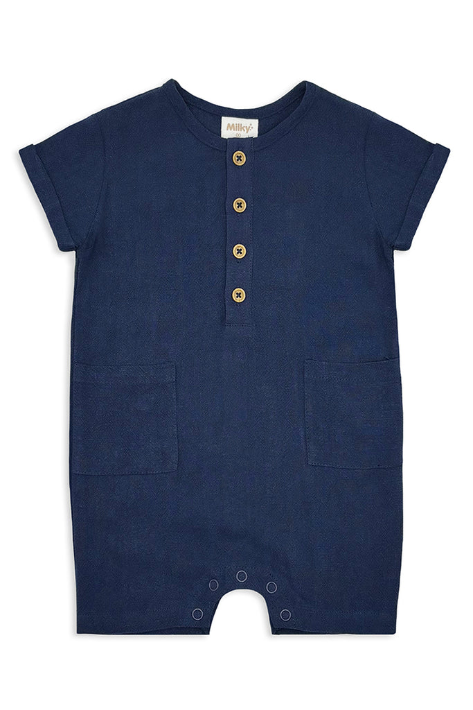 The Milky Clothing Linen Romper is a must-have summer essential, crafted from a soft, breathable cotton blend for superior comfort during warm-weather adventures. Designed to be gender-neutral, this versatile romper features convenient snaps at the crotch and buttons at the front for effortless dressing and quick changes. For a coordinated look, the same fabric is also available in Milky's Linen Shirt and Short Set, perfect for dressing the whole family in style.